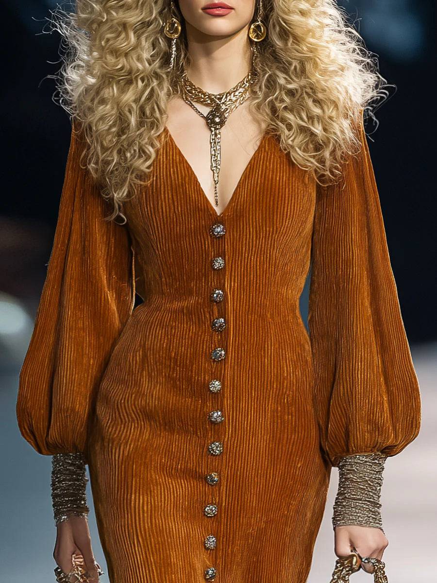 Retro Puff Sleeve Caramel Brown Corduroy Midi Dress with Button Details