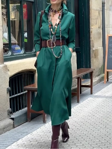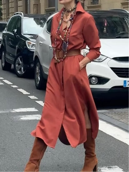 Button-Down Midi Shirt Dress with Lapel and Pocket