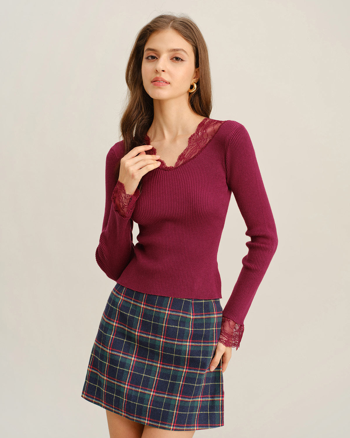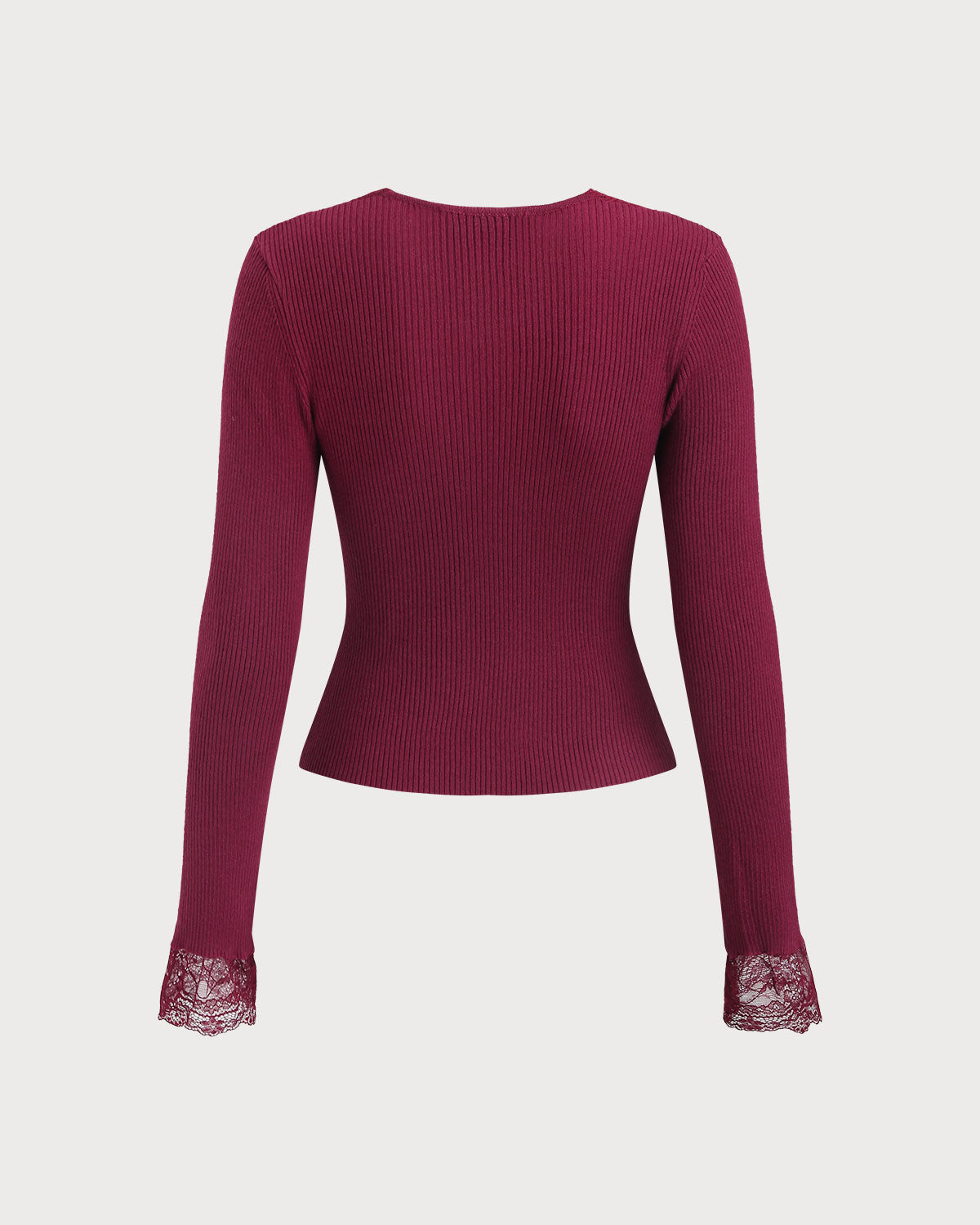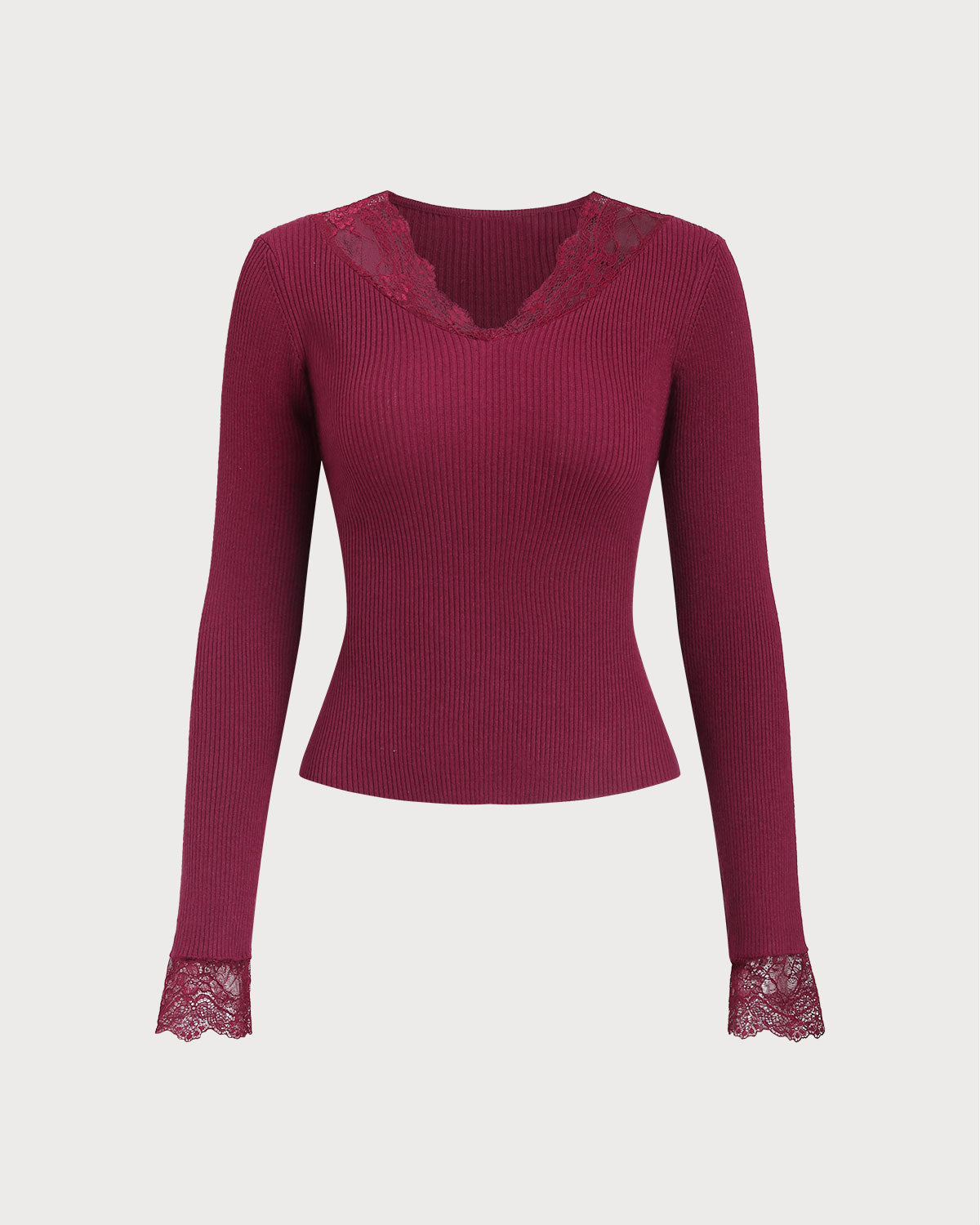 חולצת טי סריג עם צווארון V בצבע אדום יין