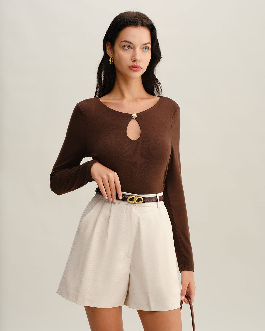חולצת טי סריג חומה עם צווארון עגול