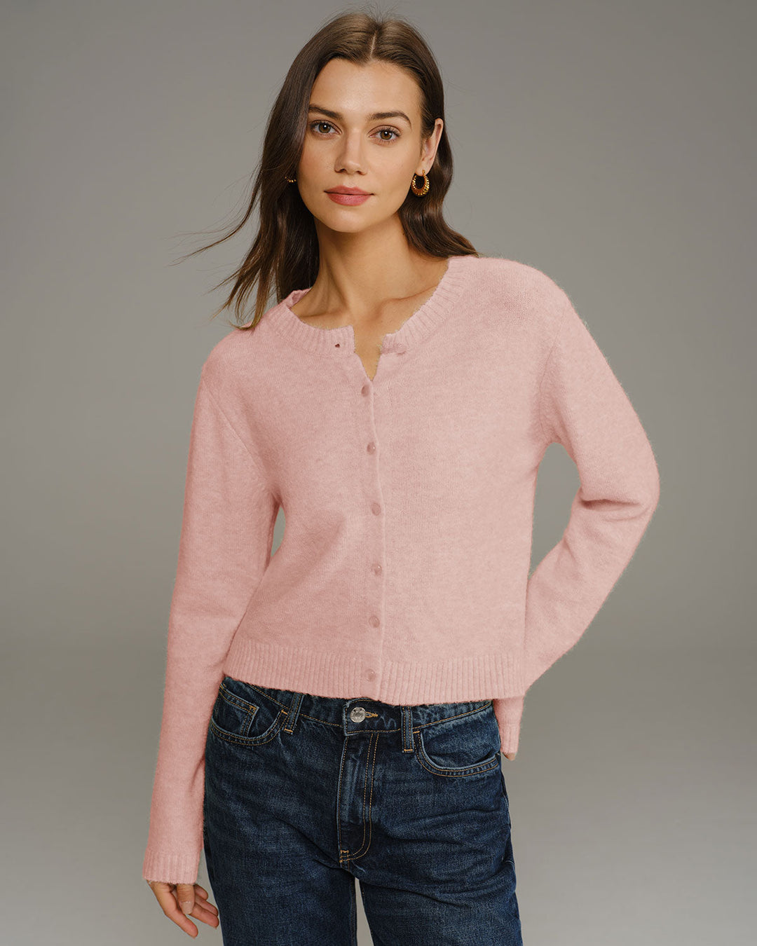 קרדיגן סרוג עם צווארון עגול בצבע ורוד