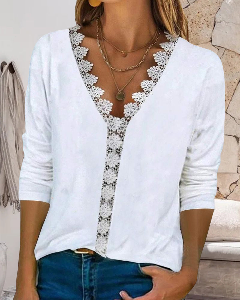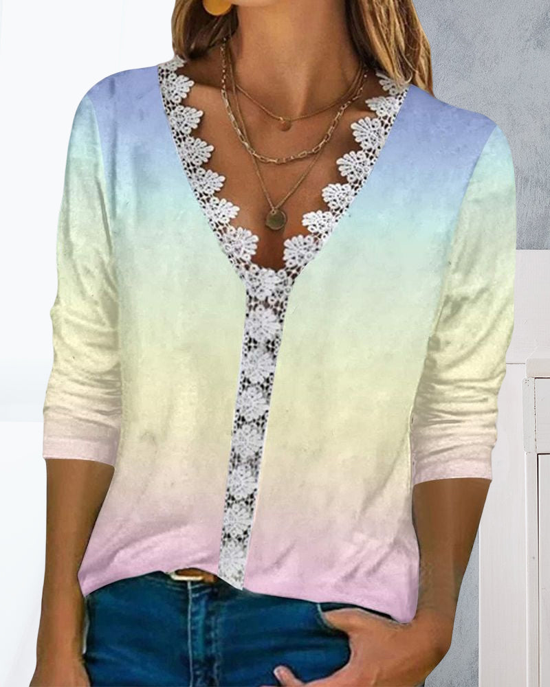 טופ מודפס עם מחשוף וי מתחרה ושרוולים 3/4