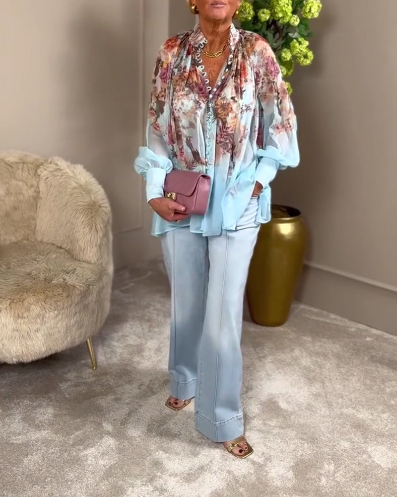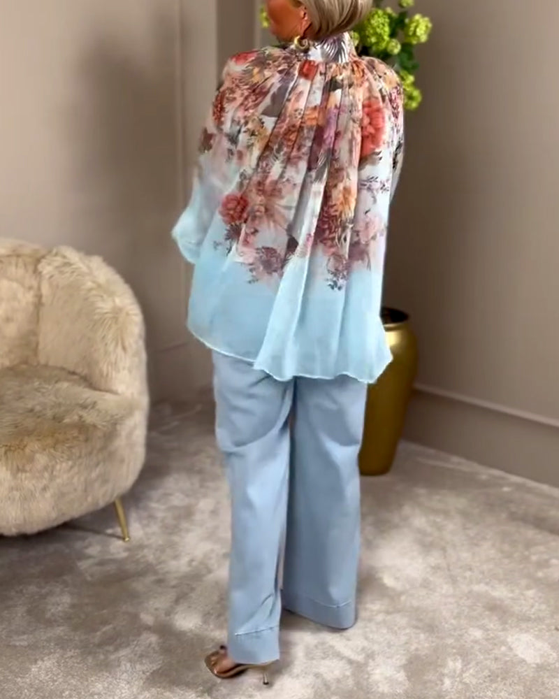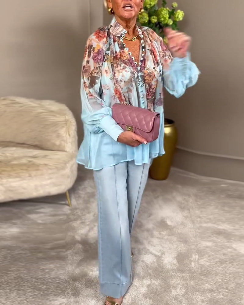 חולצה מודפסת עם שרוולי פנס וצווארון עומד