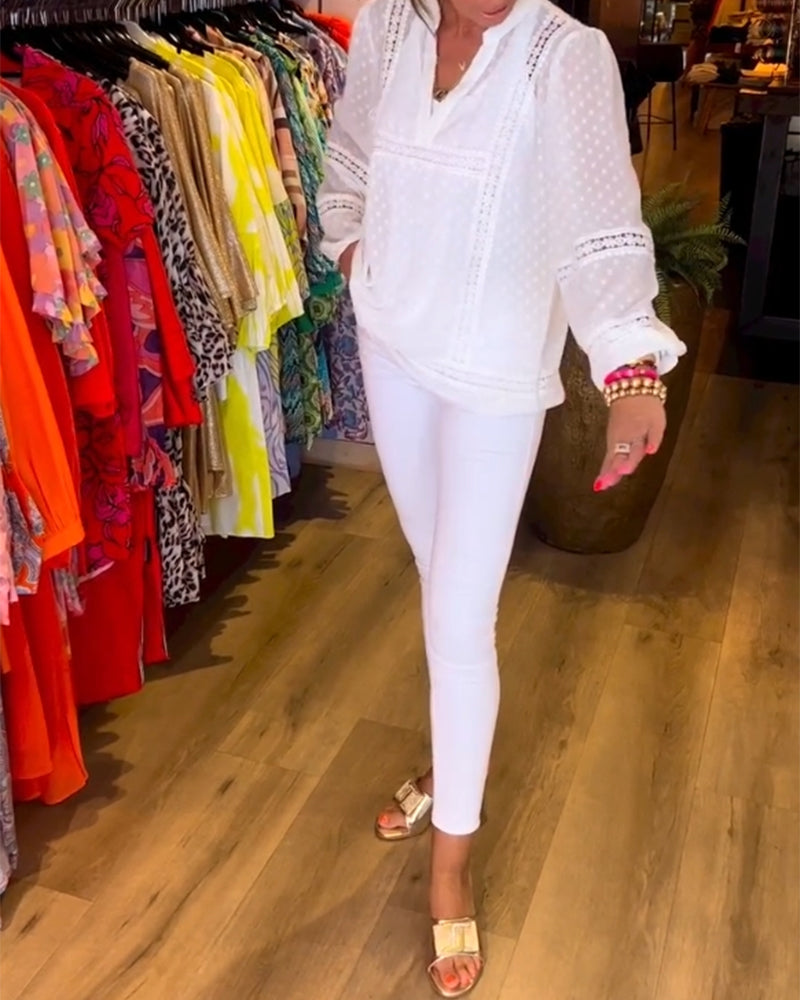 טופ עם צווארון V ושרוולים ארוכים ופרטי תחרה