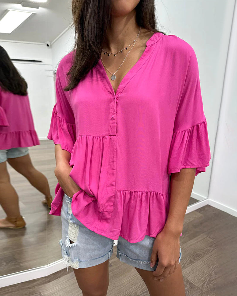 חולצה עם צווארון V ושרוולים מקושטים בצבע אחיד