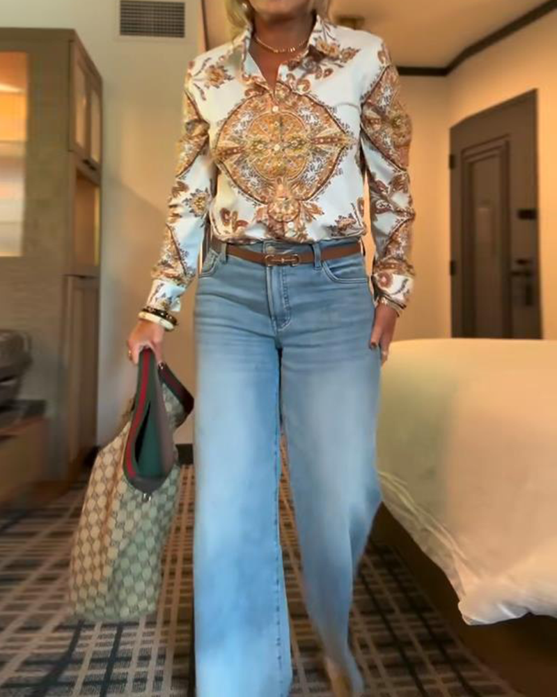 סווטשירט ארוך שרוולים מודפס עם צווארון חולצה