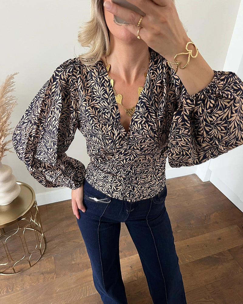 חולצה מודפסת עם צווארון V עמוק ושרוולים נפוחים