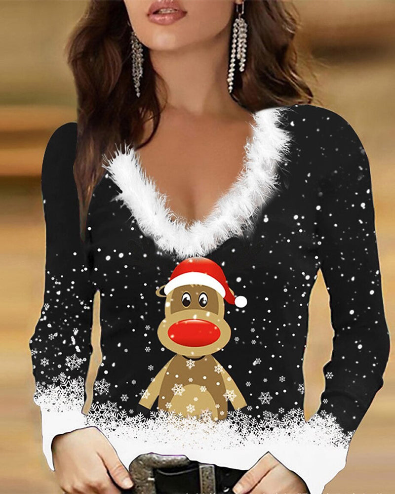 טופ רגוע עם צווארון V והדפס חגיגי של כוס יין