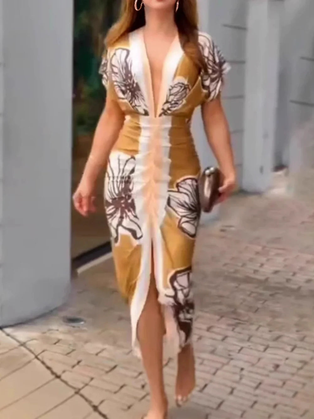 שמלת קפלים פרחונית עם צווארון V ושרוולים קצרים