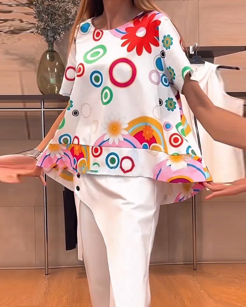 חולצת טי קז'ואל עם צווארון עגול והדפס פרחוני