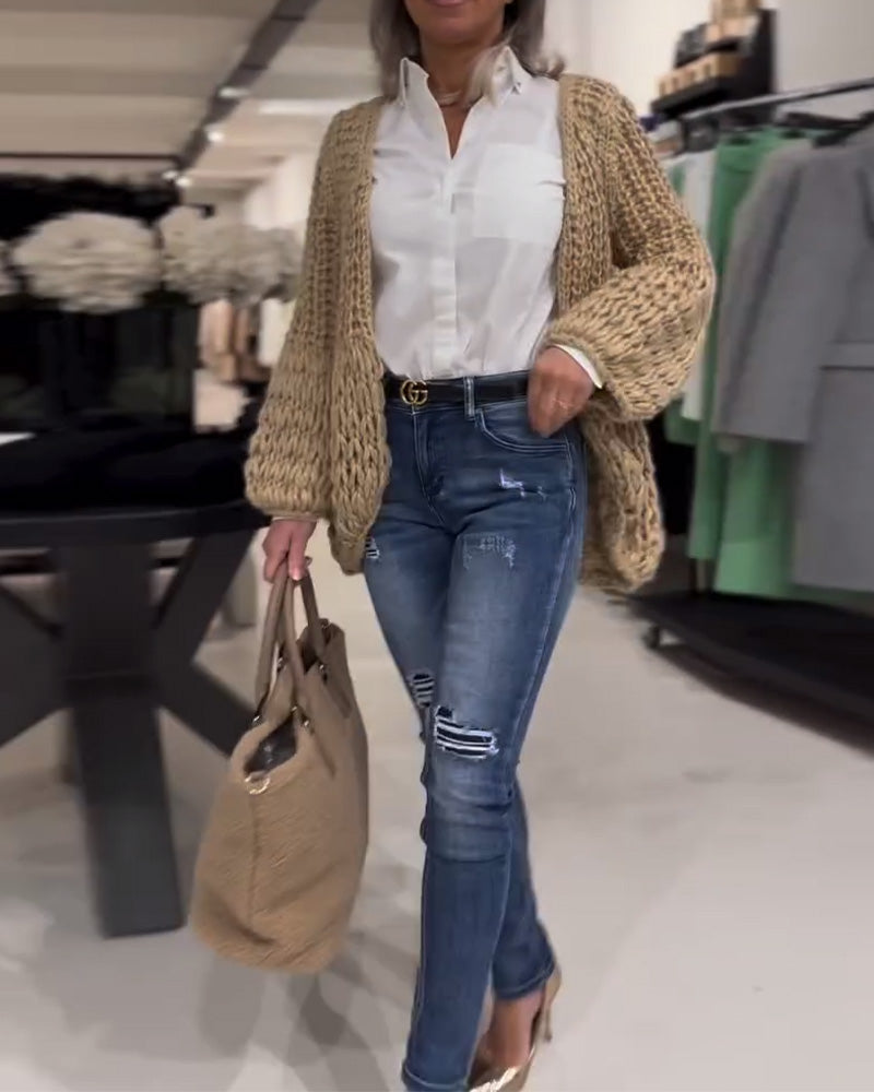 קרדיגן חצי שרוול בצבע אחיד עם כיס - סגנון קז'ואל