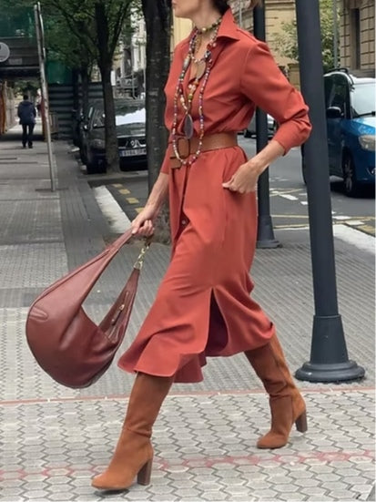 שמלת מידי עם שרוולים תפוחים בצבע חום קרמל ועם עיטורי כפתורים
